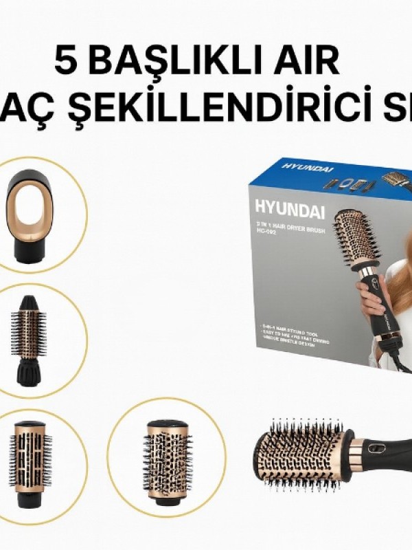 Hyundai HC-092, profesyonel düzeyde performans sunan 5 başlıklı çok işlevli saç şekillendirme setidir. Saç kurutma makinesi, hava şekillendirici, fön fırçası ve maşa özelliklerini tek bir cihazda birleştirir. 1000W gücüyle hızlı ısınır, güçlü hava akışı sayesinde saçlarınızı kısa sürede kuruturken aynı anda şekillendirir.