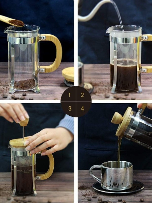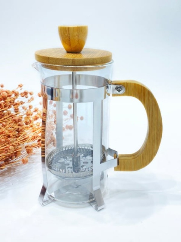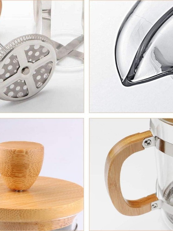 Paslanmaz çelik süzgeç sistemi sayesinde kahvenizin tortusuz, pürüzsüz bir şekilde demlenmesini sağlar. Ahşap kapak ve sap tasarımı ısıya karşı güvenli bir tutuş sunarken, cam haznesi sıcak içeceklerin aromasını korur.