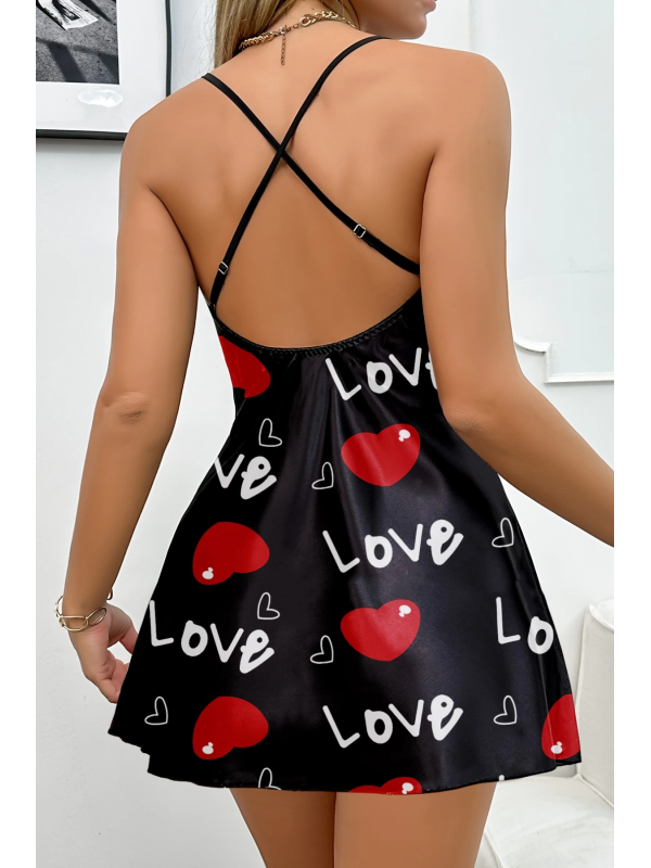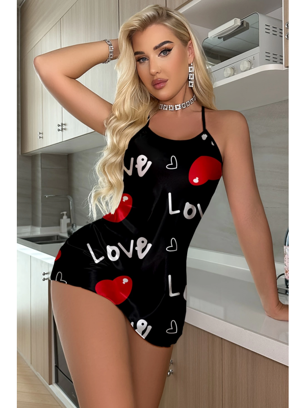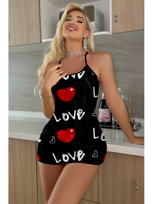Aşk Temalı Kalp Desenli Siyah Saten Gecelik lilaTM1325