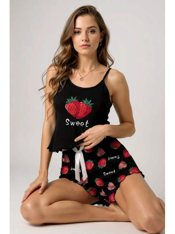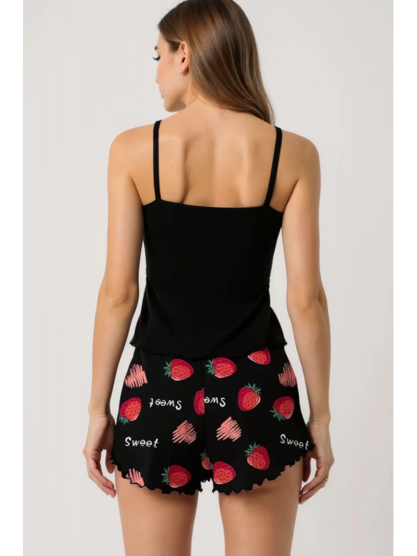 Çilek Baskılı Siyah Askılı Şortlu Pijama Takımı lilaTM1359
