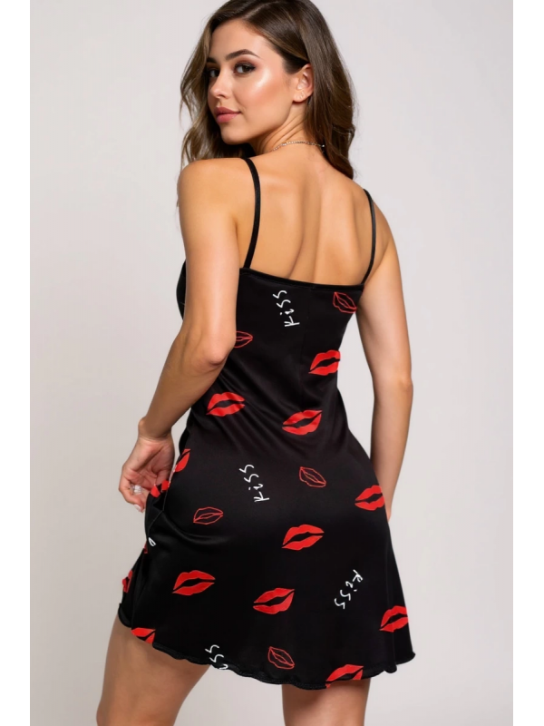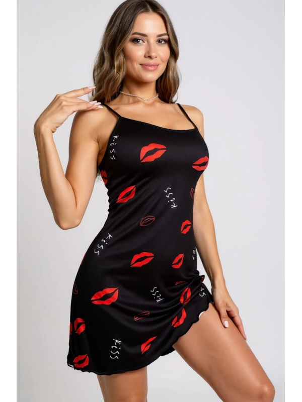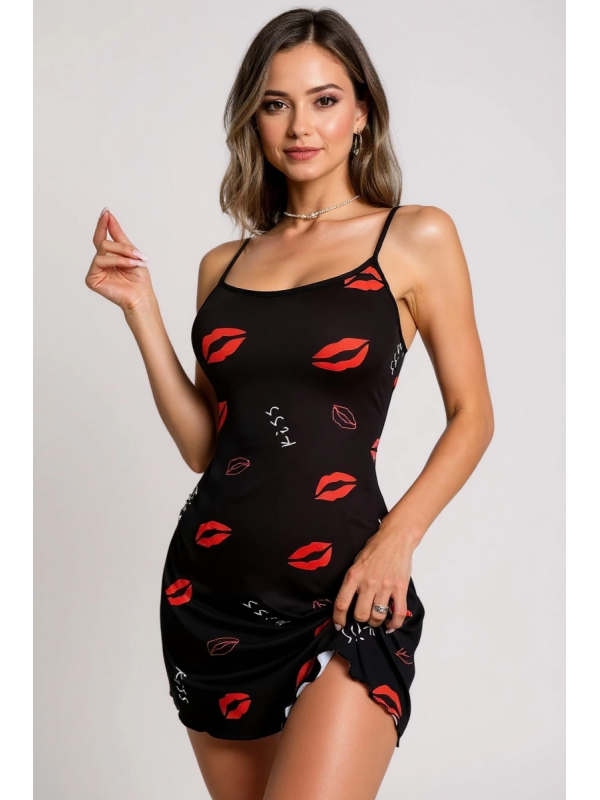 Dudak Desenli Siyah Askılı Gecelik lilaTM1365