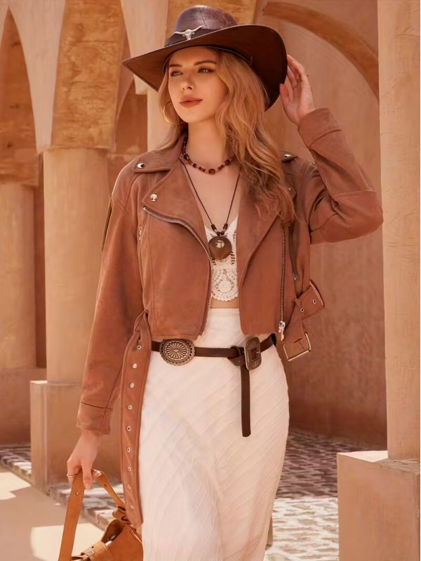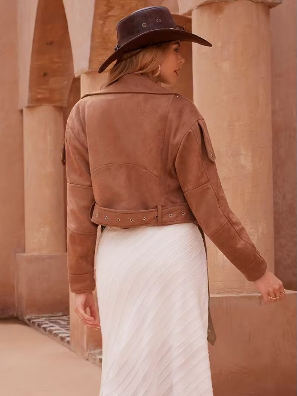 Deri Ceket - Haki Tam Fermuarlı Uzun Kollu Motosiklet Montu…