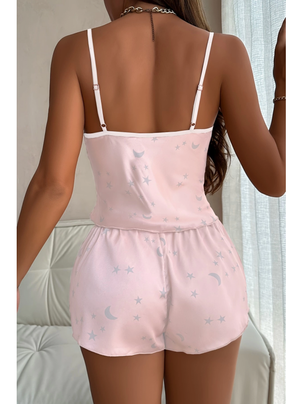 Gökyüzü Desenli Pembe Saten Şortlu Gecelik Takım lilaTM1328