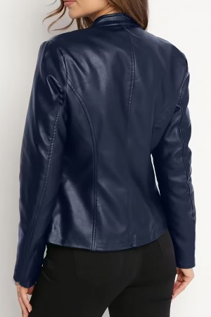 Deri Ceket - Lacivert Tam Fermuarlı Uzun Kollu Motosiklet Montu…
