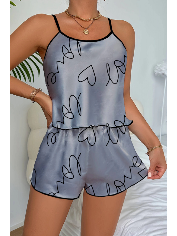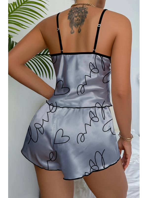 Love Baskılı Gri Saten Şortlu Gecelik Takım lilaTM1335