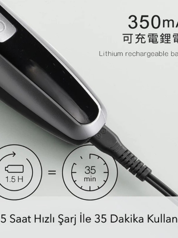 Güçlü 350mAh lityum batarya sayesinde 1,5 saatte tam şarj olur ve 4 saate kadar kesintisiz kullanım sağlar. USB girişi ile evde, ofiste veya seyahatte kolayca şarj edilebilir.