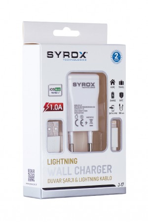 Syrox J17 iPhone Lightning Kablolu Şarj Aleti Set 1.0A BeyazDuvar Tipi Seyahat Şarj Aleti ve Lightni..
